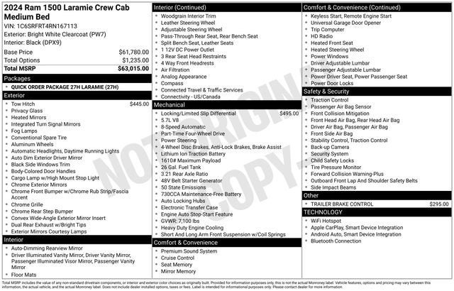 Northside Chevrolet Buick GMC is delighted to offer this outstanding-looking 2024 Ram 1500 Laramie in Bright White Clearcoat, beautifully equipped with Quick Order Package 27H Laramie, 10 Speakers, 3 Rear Seat Head Restraints, 3.21 Rear Axle Ratio, 4 Way Front Headrests, 4-Wheel Disc Brakes, 48V Belt Starter Generator, 4G LTE Wi-Fi Hot Spot, ABS brakes, Active Noise Control System, Air Conditioning, Alloy wheels, AM/FM radio: SiriusXM with 360L, Anti-Spin Differential Rear Axle, Apple CarPlay, Apple CarPlay/Android Auto, Audio memory, Auto-dimming door mirrors, Auto-Dimming Exterior Driver Mirror, Auto-dimming Rear-View mirror, Automatic temperature control, Brake assist, Bumpers: chrome, Chrome Exterior Mirrors, Class IV Receiver Hitch, Compass, Connected Travel & Traffic Services, Connectivity - US/Canada, Convex Wide-Angle Exterior Mirror Insert, Delay-off headlights, Driver door bin, Driver Seat Memory, Driver vanity mirror, Dual front impact airbags, Dual front side impact airbags, Dual Rear Exhaust w/Bright Tips, Electronic Stability Control, Exterior Mirrors Courtesy Lamps, Exterior Mirrors w/Heating Element, Exterior Mirrors w/Memory, Exterior Mirrors w/Supplemental Signals, For Details, Visit DriveUconnect.com, For More Info, Call 800-643-2112, Front anti-roll bar, Front Center Armrest w/Storage, Front dual zone A/C, Front fog lights, Front reading lights, Front Seat Back Map Pockets, Front wheel independent suspension, Fully automatic headlights, Garage door transmitter, Global Telematics Box Module (TBM), Google Android Auto, GPS Navigation, HD Radio, Heated door mirrors, Heated Front Seats, Heated front seats, Heated Steering Wheel, Heated steering wheel, Heavy-Duty Engine Cooling, HEMI Badge, Illuminated entry, Integrated Voice Command w/Bluetooth®, Leather steering wheel, Leather Trim 40/20/40 Bench Seat, Low tire pressure warning, Memory seat, Navigation System, Occupant sensing airbag, Outside temperature display, Overhead airbag, Overhead console, Panic alarm, ParkView Rear Back-Up Camera, Passenger door bin, Passenger vanity mirror, Power 2-Way Driver Lumbar Adjust, Power 2-Way Passenger Lumbar Adjust, Power 8-Way Driver & Passenger Seats, Power door mirrors, Power driver seat, Power passenger seat, Power steering, Power windows, Power-Folding Mirrors, Radio data system, Radio: Uconnect 5 Nav w/8.4 Display, RAM Grille Badge - Chrome, Rear 60/40 Folding Seat, Rear anti-roll bar, Rear seat center armrest, Rear step bumper, Remote keyless entry, Security system, SiriusXM Radio Service, SiriusXM w/360L, Speed control, Split folding rear seat, Steering wheel mounted audio controls, Tachometer, Telescoping steering wheel, Tilt steering wheel, Traction control, Trailer Brake Control, Trip computer, Turn signal indicator mirrors, USB Host Flip, Variably intermittent wipers, Ventilated Front Seats, Ventilated front seats, Voltmeter, and Wheels: 18 x 8 Aluminum Base Painted! Odometer is 23247 miles below market average! Priced below KBB Fair Purchase Price!